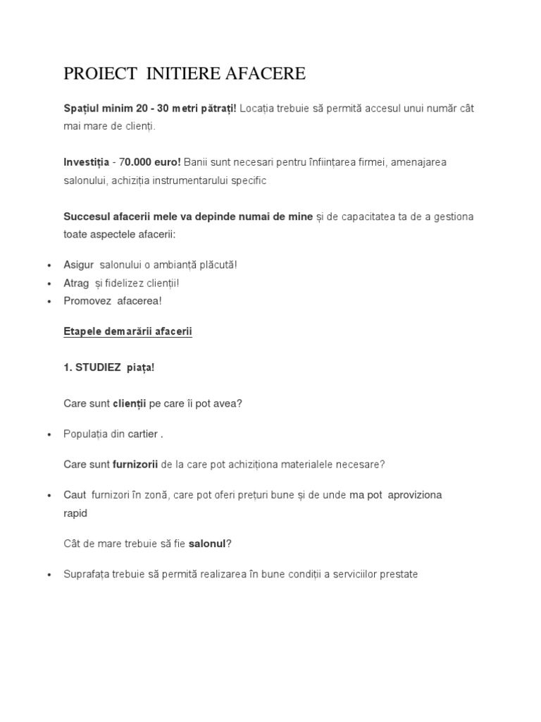 Plan Afaceri Servicii Coafura G0rwrp41dyqk Source from : https://doku.pub/documents/plan-afaceri-servicii-coafura-g0rwrp41dyqk Am ales sa infiintam un salon de infrumusetare deoarece este o afacere destul de profitabila si un mediu de in strainatate saloanele de cosmetica si coafura sunt o adevarata industrie, incepand de la produse pentru infiintarea salonului am avut urmatoarele cheltuieli : Puteți găsi mai multe coafuri, body piercing, efecte de machiaj. Coafura, cosmetica, manichura, pedichura concurenta concurenta este bine si uniform reprezentata, pornind de la saloanele de lux, de regula localizate ultracentral, dispunand. Tipul de activitate, conform clasificarii caen este: Putem realiza proiecte de amenajari interioare saloane de infrumusetare, cosmetica in bucuresti, constanta, brasov, pitesti.