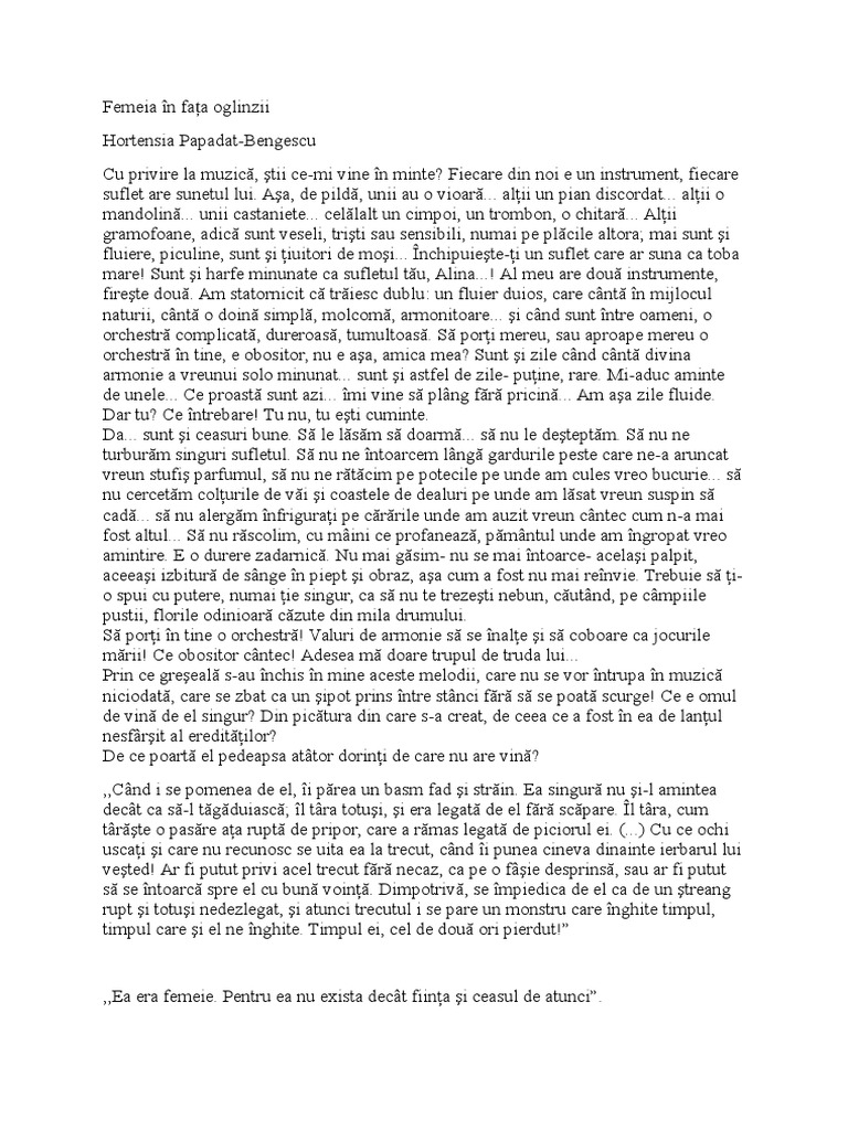 Imi doresc sa incercati sa aveti o intalnire cu oglinda in fiecare zi, in fiecare seara, in fiecare dimineata in care sa fiti autentice mai mult de un minut din cele 24 de ore, sa dati la o parte masca, fara fard, fara a masca cearcanele, sa va cititi interiorul. Femeia în fața oglinzii book. Cea mai nouă operă a sa, femeia în fața oglinzii, are în centru trei femei ce au trăit în epoci diferite, cartea putând fi considera o pledoarie în favoarea.