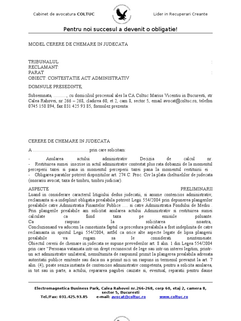 Aşadar, cererea de chemare �n judecată este actul procedural prin care reclamantul, pun�nd �n mişcare acţiunea civilă şi, totodată, de regulă, �nvestind instanţa cu soluţionarea ei, �şi formulează pretenţiile faţă de cel chemat �n judecată, solicit�nd concursul instanţei pentru satisfacerea lor. Însă în cazul în care nu vă permiteți serviciile unui asemenea specialist, puteți întocmi cererea de. Transporturi cu camionul din elveţia către toate ţările europene şi vice versa.